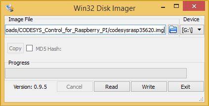 Following the advice in the product data sheet I downloaded and installed Win32diskimager 0.9.5 from http://sourceforge.net/projects/win32diskimager/. I plugged the microSDHC card into an SDCard carrier and then plugged this into a USB SDCard reader (The internal SDXC slot on my MacBook is not recognised by vmware Fusion, see vmware kb1035825). I then launched Win32DiskImager, and browsed to codesysrasp35620.img in the directory I had previously unzipped, selected device G: which corresponds to the SDCard, and clicked Write.
