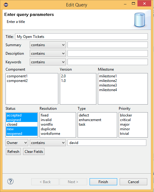 When you click Next you will be prompted to Add a new query, queries give you the ability to filter lists of trac tickets to those appropriate to you, a component, a release or whatever. The example below shows all of my open tickets.