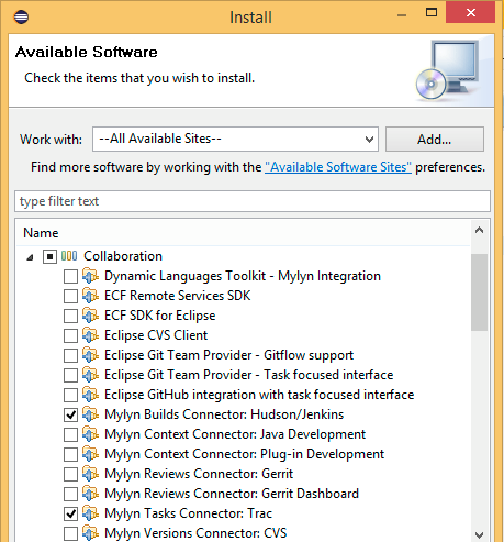 In Eclipse go to Help->Install New Software…, in the Install dialog in the Work with: drop down pick –All Available Sites– and then under Collaboration check Mylyn Builds Connector: Hudson/Jenkins and Mylyn Tasks Connector : Trac.