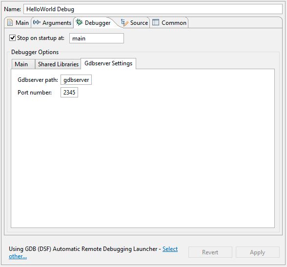 Now select the Gdbserver Settings sub-tab, the default settings worked for me and looked like this.